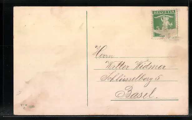Personenbezogene Daten auf der Rückseite der Karte wurden durch blauen Textmarker unkenntlich gemacht. Die blauen Stellen sind auf die Vorderseite durchgeweicht und wirken sich negativ auf das Postkartenfoto aus