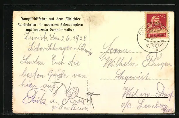 gelaufen 1928, Eckknicke li. unten und re. oben, guter Zustand