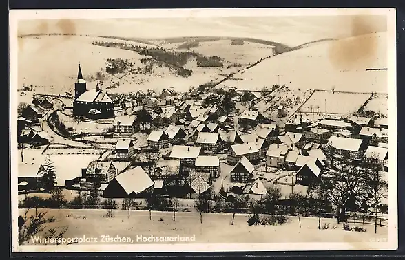 AK Züschen /Hochsauerland, Verschneite Ortsansicht