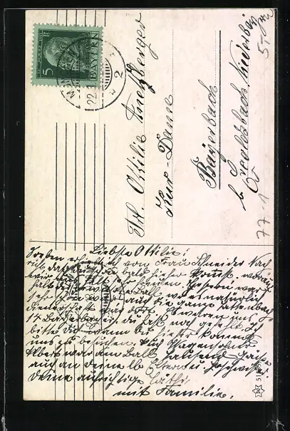 Personenbezogene Daten auf der Rückseite der Karte wurden durch blauen Textmarker unkenntlich gemacht. Die blauen Stellen sind auf die Vorderseite durchgeweicht und wirken sich negativ auf das Postkartenfoto aus