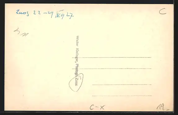 Personenbezogene Daten auf der Rückseite der Karte wurden durch blauen Textmarker unkenntlich gemacht. Die blauen Stellen sind auf die Vorderseite durchgeweicht und wirken sich negativ auf das Postkartenfoto aus