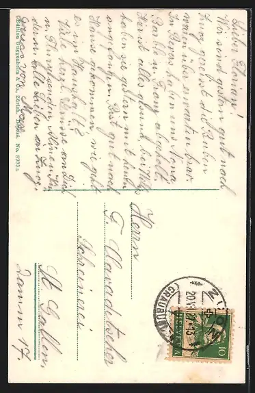 Personenbezogene Daten auf der Rückseite der Karte wurden durch blauen Textmarker unkenntlich gemacht. Die blauen Stellen sind auf die Vorderseite durchgeweicht und wirken sich negativ auf das Postkartenfoto aus