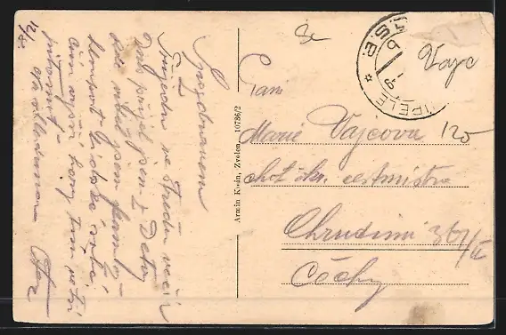 alte Ansichtskarte, gelaufen, Briefmarke entfernt, rückseitig Oberflächenschaden, Eckknick li. oben, guter Zustand