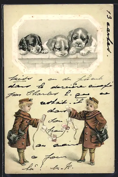 AK Zwei Briefträger werden von Hundewelpen beobachtet
