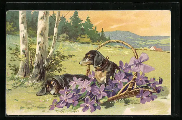 AK Zwei Dackel mit Blumenkorb auf einer Sommerwiese