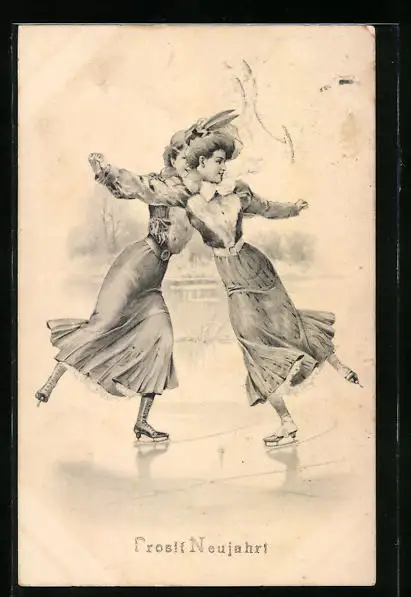 AK Zwei Frauen auf Schlittschuhen, Neujahrsgruss