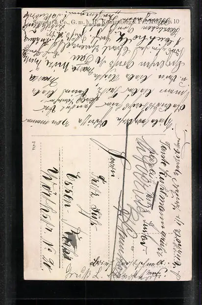 Personenbezogene Daten auf der Rückseite der Karte wurden durch blauen Textmarker unkenntlich gemacht. Die blauen Stellen sind auf die Vorderseite durchgeweicht und wirken sich negativ auf das Postkartenfoto aus