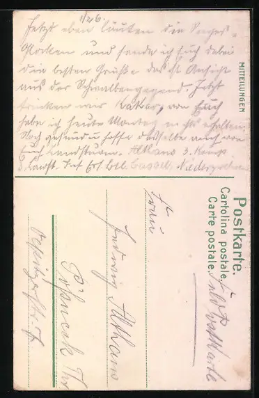 Personenbezogene Daten auf der Rückseite der Karte wurden durch blauen Textmarker unkenntlich gemacht. Die blauen Stellen sind auf die Vorderseite durchgeweicht und wirken sich negativ auf das Postkartenfoto aus