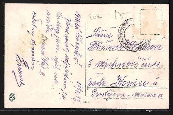 Personenbezogene Daten auf der Rückseite der Karte wurden durch blauen Textmarker unkenntlich gemacht. Die blauen Stellen sind auf die Vorderseite durchgeweicht und wirken sich negativ auf das Postkartenfoto aus
