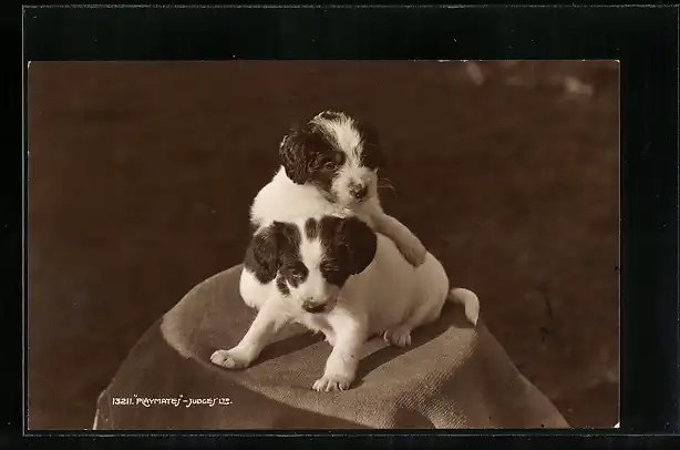 AK Zwei Hundewelpen auf einem Tischchen