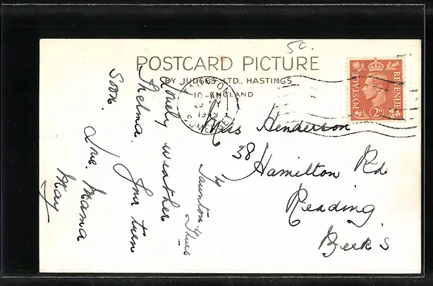 Personenbezogene Daten auf der Rückseite der Karte wurden durch blauen Textmarker unkenntlich gemacht. Die blauen Stellen sind auf die Vorderseite durchgeweicht und wirken sich negativ auf das Postkartenfoto aus