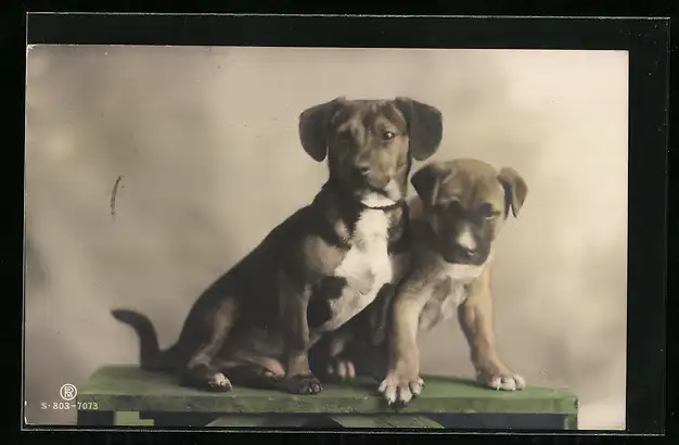 AK Zwei Hundewelpen auf einer Kiste sitzend