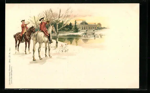 AK Zwei Jäger mit Hörnern zu Pferde am Ufer im Winter