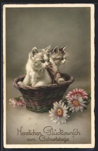 AK Zwei Katze in einem Korb mit Blumen