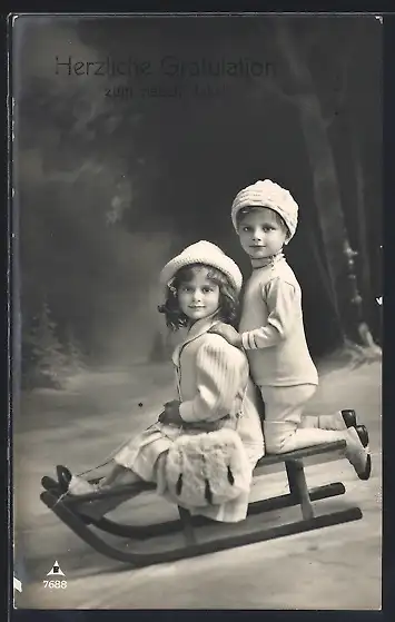 AK Zwei Kinder auf einem Schlitten