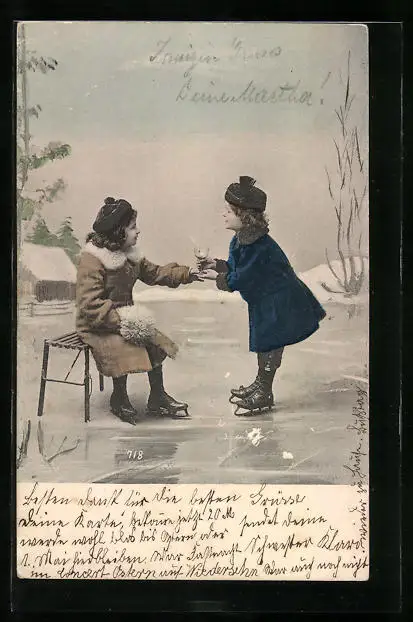 AK Zwei Mädchen auf Schlittschuhhen mit Glas