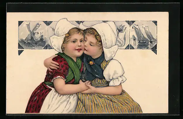 AK Zwei Mädchen in niederländischer Tracht umarmen sich