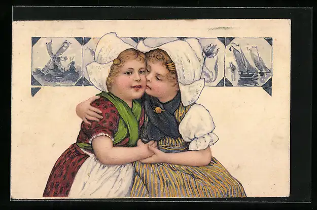 AK Zwei Mädchen in niederländischer Tracht umarmen sich