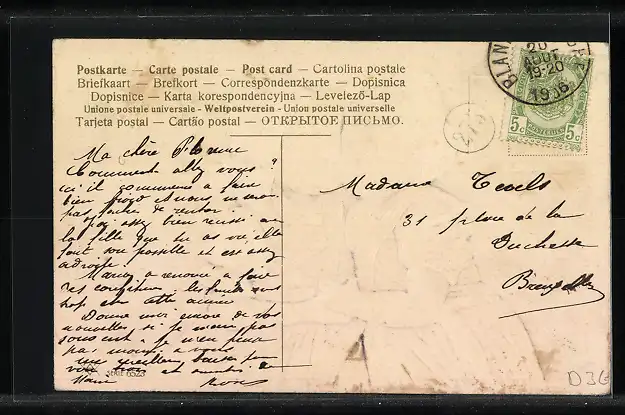 Personenbezogene Daten auf der Rückseite der Karte wurden durch blauen Textmarker unkenntlich gemacht. Die blauen Stellen sind auf die Vorderseite durchgeweicht und wirken sich negativ auf das Postkartenfoto aus
