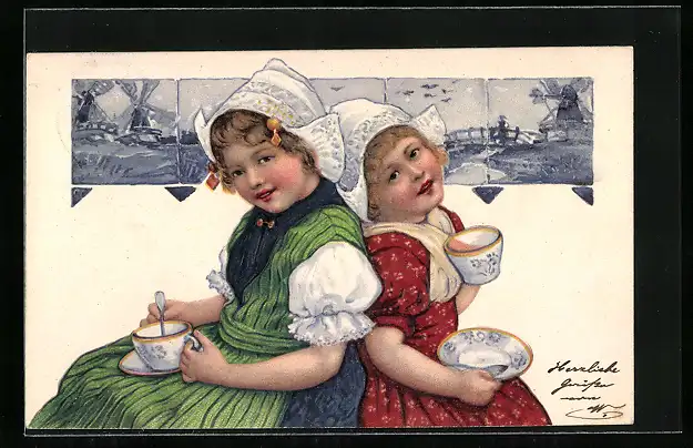 AK Zwei Mädchen trinken Tee in niederländischer Tracht