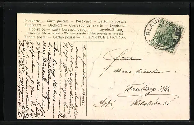 Personenbezogene Daten auf der Rückseite der Karte wurden durch blauen Textmarker unkenntlich gemacht. Die blauen Stellen sind auf die Vorderseite durchgeweicht und wirken sich negativ auf das Postkartenfoto aus