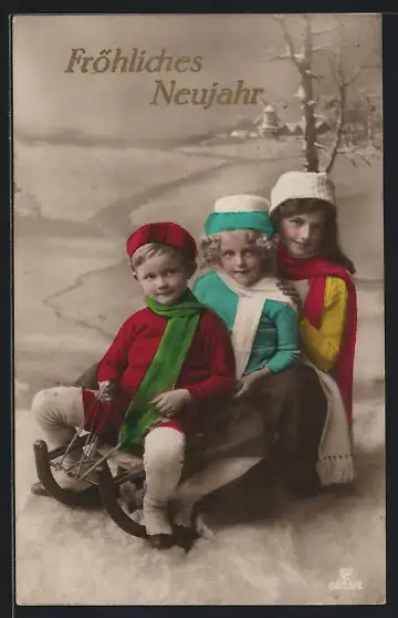 AK Zwei Mädchen und ein Junge fröhlich auf einem Schlitten im Schnee