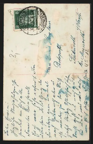 Personenbezogene Daten auf der Rückseite der Karte wurden durch blauen Textmarker unkenntlich gemacht. Die blauen Stellen sind auf die Vorderseite durchgeweicht und wirken sich negativ auf das Postkartenfoto aus