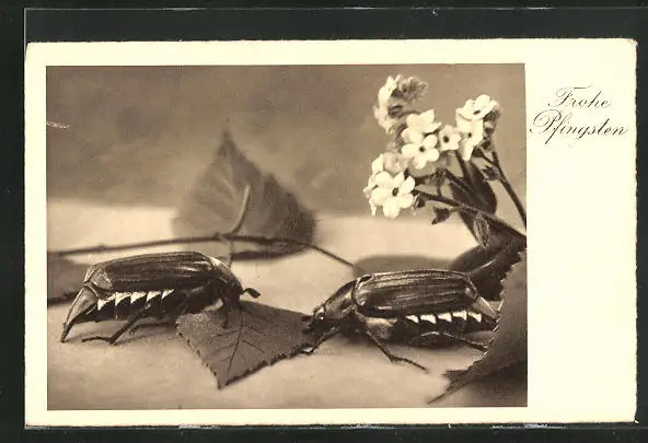 AK Zwei Maikäfer an einem Zweig mit Blüten, Pfingstgruss
