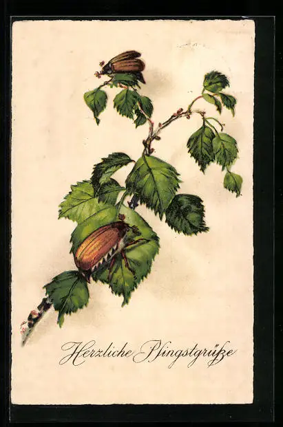 AK Zwei Maikäfer auf Birkenblättern, Pfingstgruss