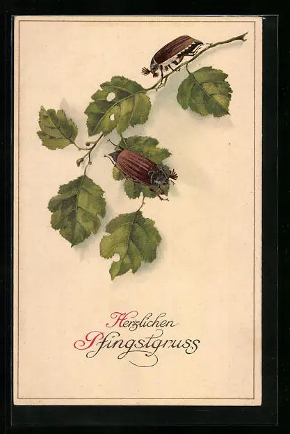 AK Zwei Maikäfer auf Birkenblättern mit Löchern, Pfingstgruss