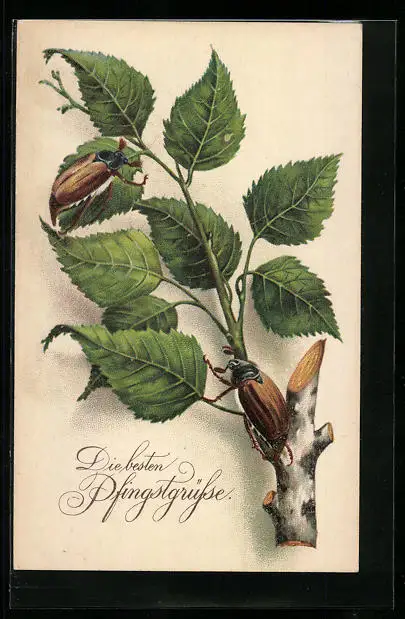 AK Zwei Maikäfer auf einem Birkenast mit Blättern, Pfingstgruss