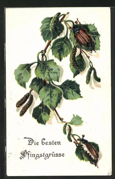 AK Zwei Maikäfer auf einem Zweig, Pfingstgruss