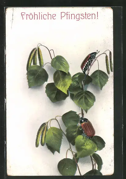 AK Zwei Maikäfer auf einem Zweig, Pfingstgruss