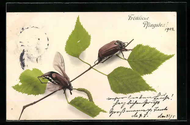 AK Zwei Maikäfer auf einem dünnen Zweig, Pfingstgruss