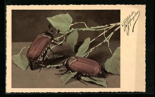AK Zwei Maikäfer in Überlebensgrösse, Pfingstgruss