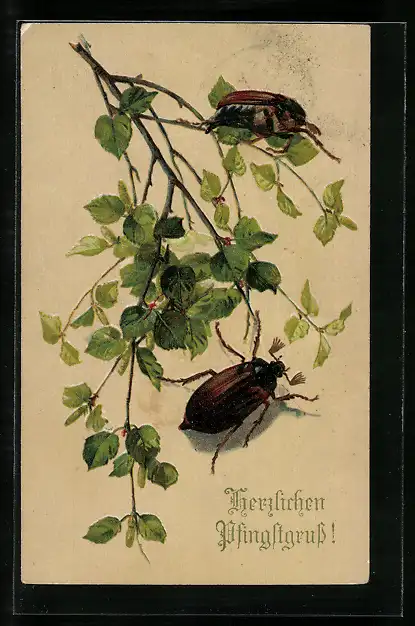 AK Zwei Maikäfer mit Birkenreisig, Pfingstgruss