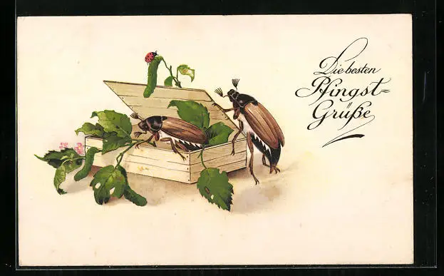 AK Zwei Maikäfer und ein Marienkäfer mit Zigarrenkiste, Pfingstgruss