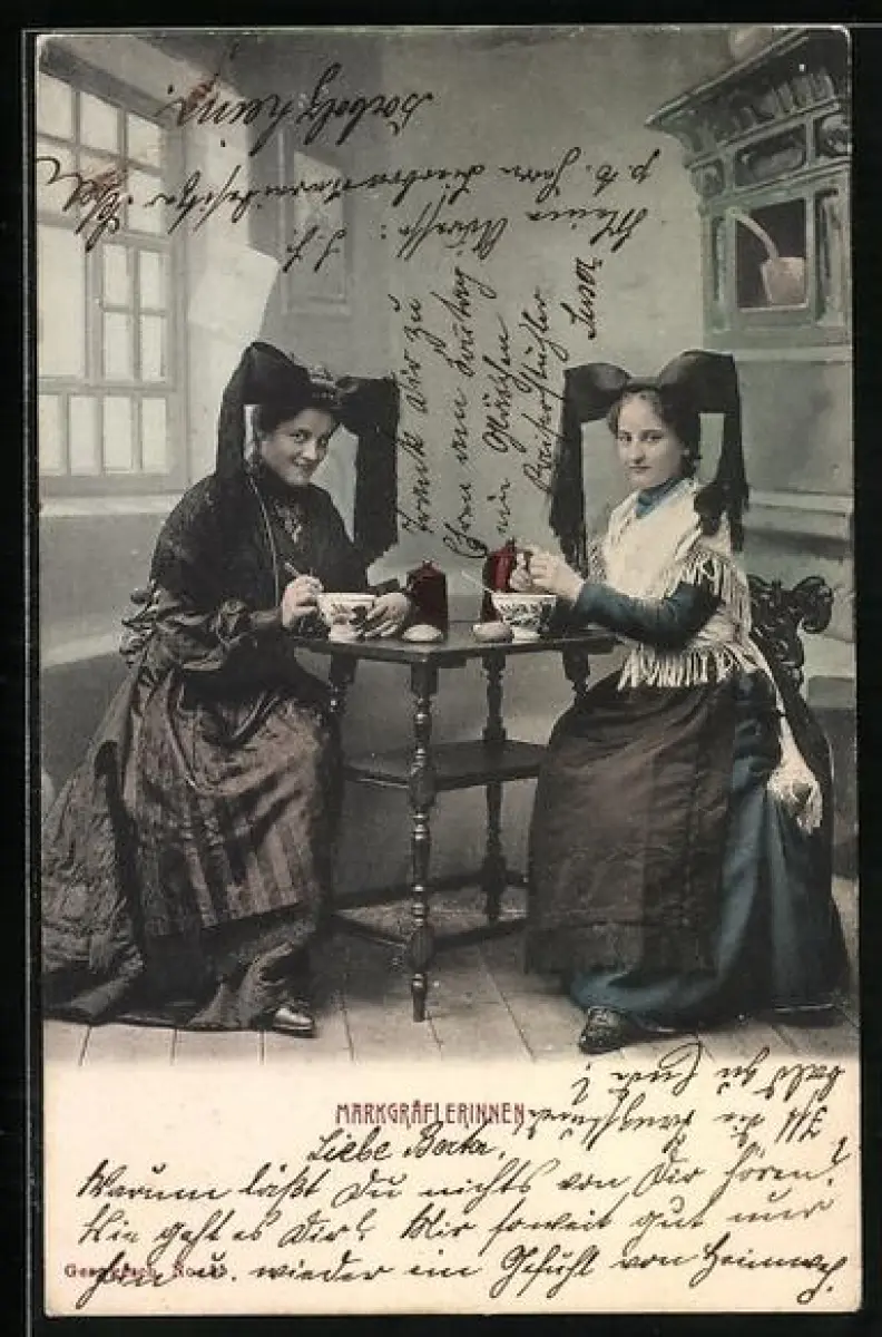 AK Zwei Markgräflerinnen an einem Tisch sitzend