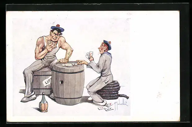 AK Zwei Matrosen mit Weinflasche beim Kartenspiel