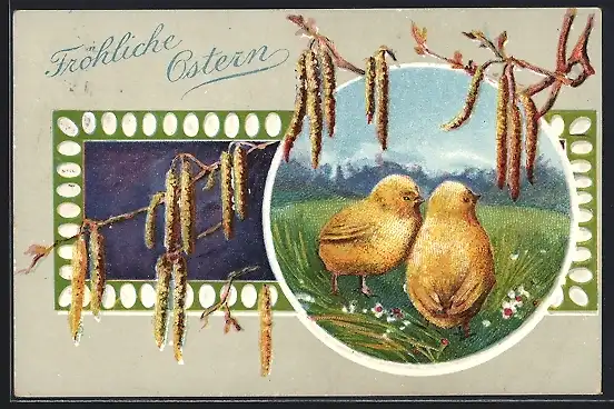 AK Zwei Osterküken auf einer Wiese, florales Passepartout