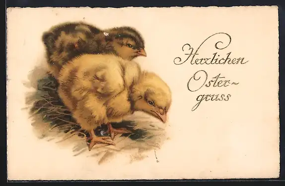 AK Zwei Osterküken im Stroh, Herzlichen Ostergruss