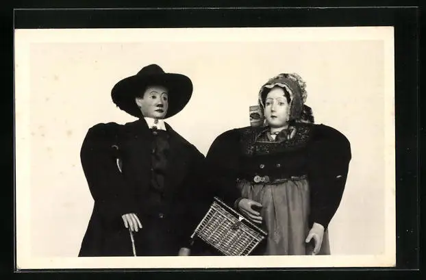 AK Zwei Puppen köstümiert in Trachten mit Korb am Arm