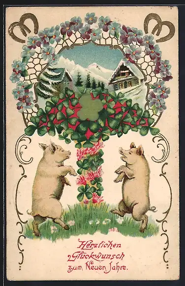 AK Zwei Schweine mit Kleeblättern und Winterlandschaft, Neujahrsgruss