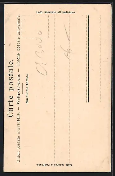 Personenbezogene Daten auf der Rückseite der Karte wurden durch blauen Textmarker unkenntlich gemacht. Die blauen Stellen sind auf die Vorderseite durchgeweicht und wirken sich negativ auf das Postkartenfoto aus