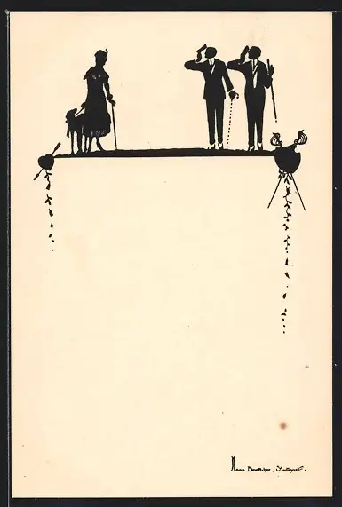 AK Zwei Studenten grüssen eine Dame, Schattenbild