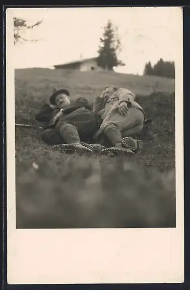 AK Zwei Wandervögel liegen auf einer Wiese, Camping