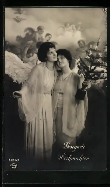 AK Zwei Weihnachtsengel mit einem kleinen Tannenbaum