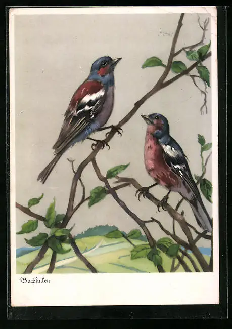 AK Zwei hübsche Buchfinken auf Zweigen sitzend