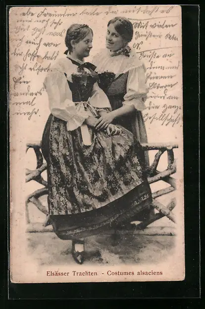 AK Zwei hübsche junge Frauen in Elsässer Tracht auf einem Zaun sitzend