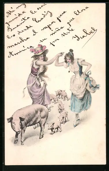 AK Zwei junge Damen und Schwein mit Ferkeln